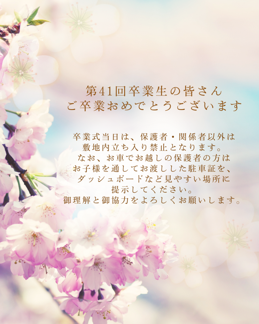 第41回卒業生の皆さん、ご卒業おめでとうございます。 卒業式当日は、保護者・関係者以外は敷地内立ち入り禁止となります。 なお、お車でお越しの保護者の方は、お子様を通してお渡しした駐車証を