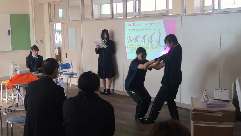 お知らせ/学校生活/授業 【介護実習報告会が行われました】 2025年12月17日 12月8日に、介護実習報告会が行われました。 介護実習とは、7月に3年生「介護総合演習」受講者が介護施設にうかがい、実際に見て体験しながら福祉の理解を深める実習です。 介護実習に参加した生徒たちは、施設利用者の特徴や介護施設での一日の流れ、注意点など、学んできたことを写真やパワーポイントを使って分かりやすく紹介してくれました。 「福祉」で学んだ知識や経験を、卒業後もぜひ活かしてほしいです。