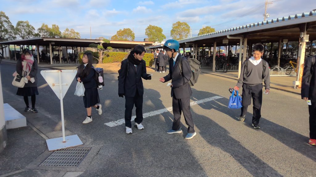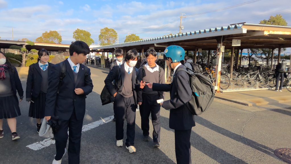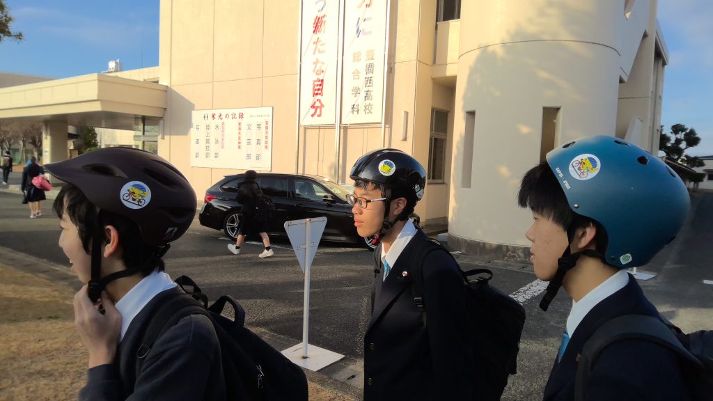 1年生/2年生/3年生/お知らせ/学校生活 「命を守るヘルメット着用促進グランプリ」の活動をしました! 2025年12月23日 愛知県警察主催の「命を守るヘルメット着用促進グランプリ」の活動として、有志生徒が特製ステッカーを配り、ヘルメット着用を呼びかけました。ステッカーは本校のキャラクターである”にっしー”と”しーにゃん”がヘルメットを着用したデザインでした。 自転車通学の生徒が非常に多い本校の生徒たち。1人でも多くの生徒がヘルメットを着用し、自ら命を守る行動をしてほしいです。