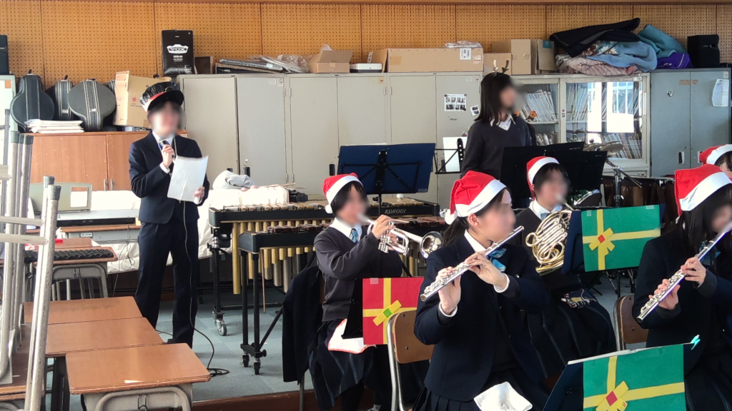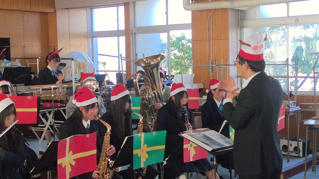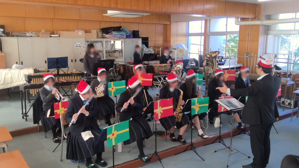 終業式の午後、吹奏楽部がクリスマス演奏会を行いました。サンタやトナカイの帽子をかぶった生徒たちが先生や生徒に向けて懐かしのメドレーを演奏してくれました。また、アンコールではお正月ソングを演奏しました。