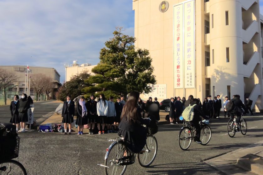 1/28の朝も正門付近に多くの生徒が並び、登校中の生徒たちに元気に声をかけていました。この日正門に立ったのは生徒会役員や女子バレーボール部、ボランティア生徒らおよそ30名。