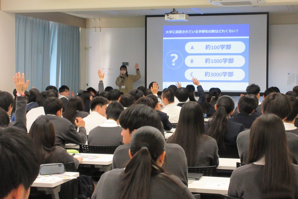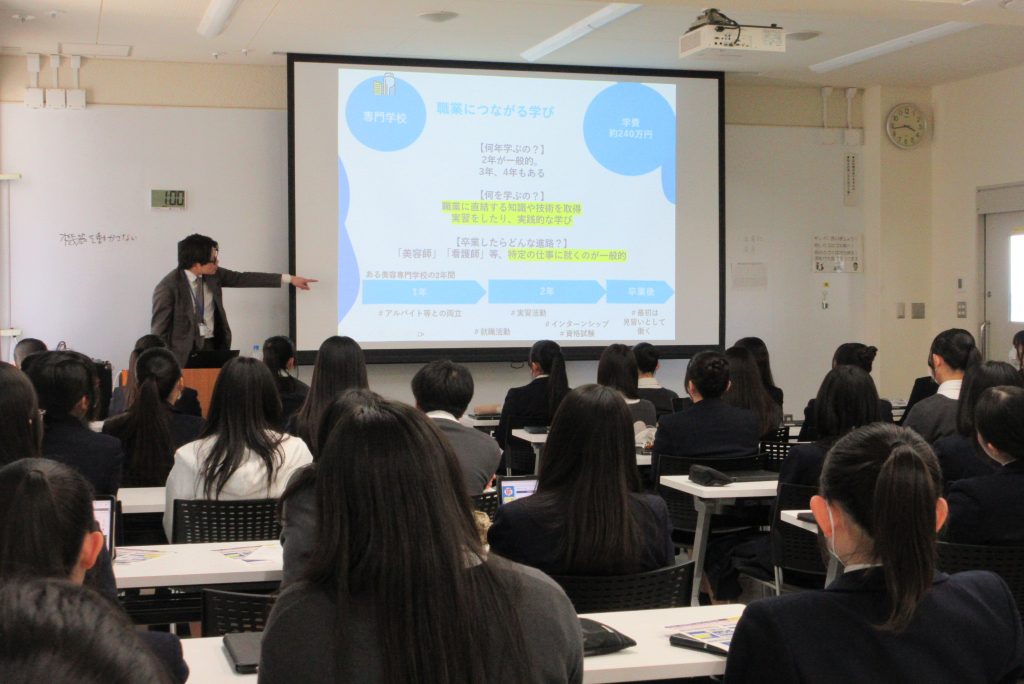 2年生は、来年度の「総合的な探究の時間」で取り組むゼミ活動について、その流れを知り、ゼミの内容と各自の興味分野との関わりについて考えました。