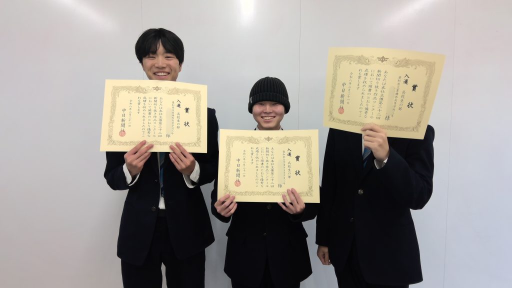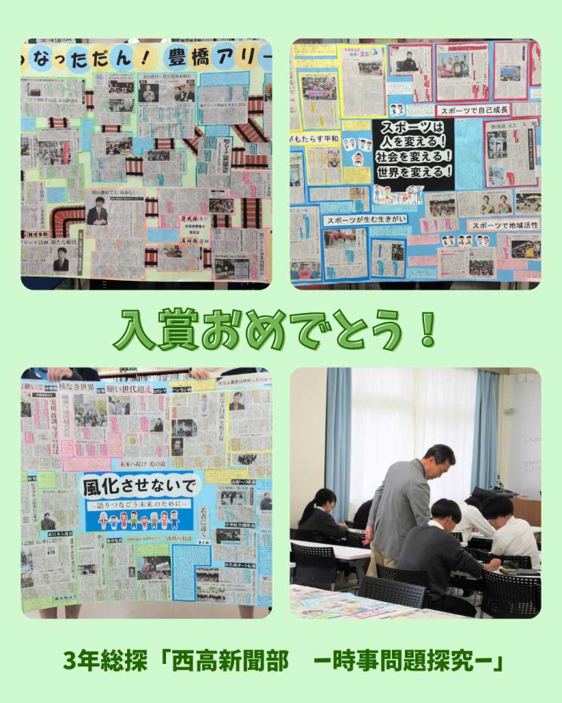 3年生/お知らせ/学校生活/授業 新聞切り抜き作品コンクールで入賞! 2026年3月5日 3年生の総合的な探究の時間「西高新聞部ー時事問題探究ー」ゼミでチャレンジした「第32回新聞切り抜き作品コンクール」の結果が発表され、2グループが入選、1グループが佳作を受賞しました! 昨年春から新聞を使って社会課題を多角的に検証。今年度は外部講師の先生から「見出し」についても学び、こだわりの詰まった作品になりました。 昨年度に続く連続受賞。チャレンジした皆さん、入賞おめでとう!