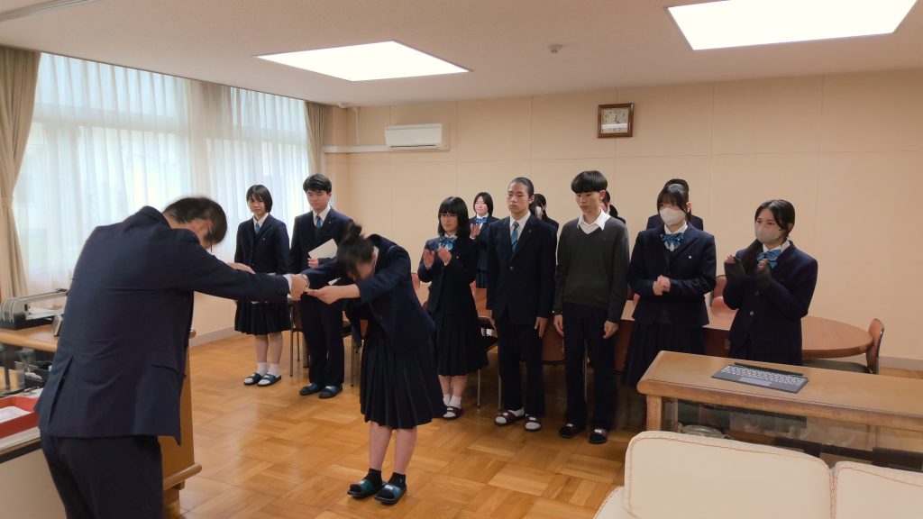 1年生/2年生/3年生/お知らせ/学校生活 前期生徒会役員決定! 2026年4月27日 4月24日、前期生徒会役員認証式が行われました。 前期にはたくさんの学校行事があります。昨年度の後期から引き続き生徒会役員を務める生徒は経験を活かして、新たに生徒会役員になった生徒はこれまで思っていたことを実現できるチャンスだと思って、8人それぞれの良さを合わせて学校行事を成功に導いて欲しいです。 前期生徒会役員の皆さん!よろしくお願いします!!