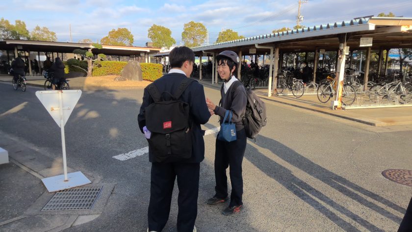 愛知県警察主催の「命を守るヘルメット着用促進グランプリ」の活動として、有志生徒が特製ステッカーを配り、ヘルメット着用を呼びかけました。ステッカーは本校のキャラクターである