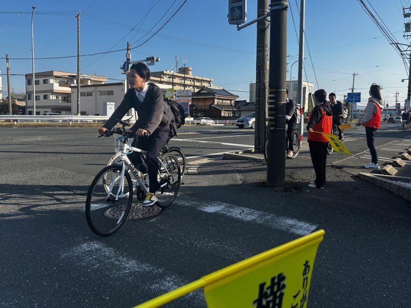 豊橋西高校は多くの生徒が自転車を利用して通学しています。 11/10(月)の朝、PTA役員・委員の皆さんとともにゼロの日交通安全運動を通学路各所で行いました。「一旦停止をしましょう」、「並列走